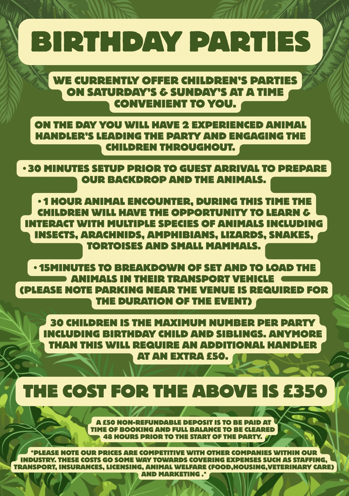 * Please note not all of these animals will attend every party, however there will be a wide range to meet and interact with. Specific animals can be requested prior to the party*