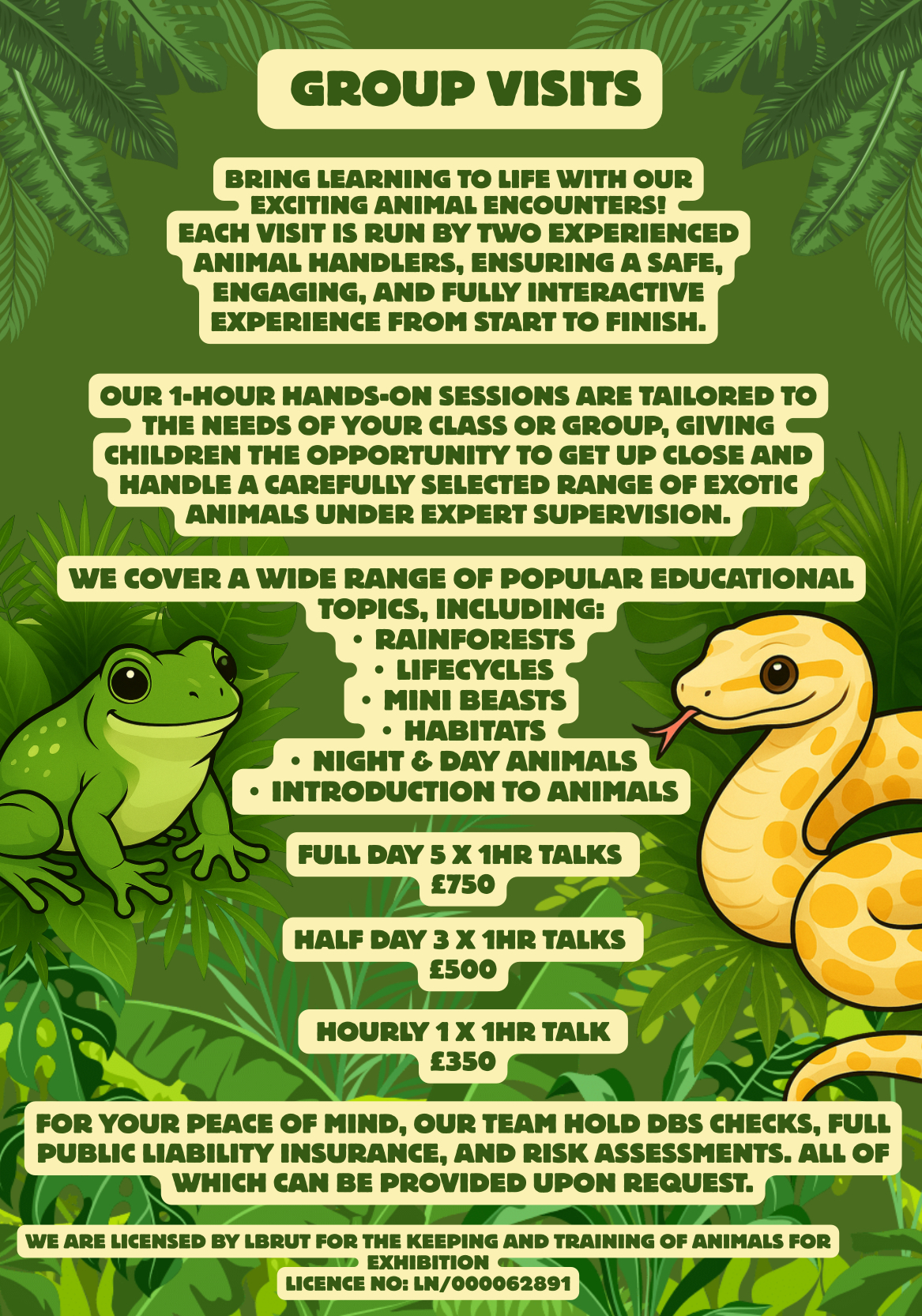 The animals that will be attending these sessions all have either insect or plant/vegetable-based diets with regards to our invertebrates, amphibians, lizards and tortoises and a carnivorous diet for our snakes.