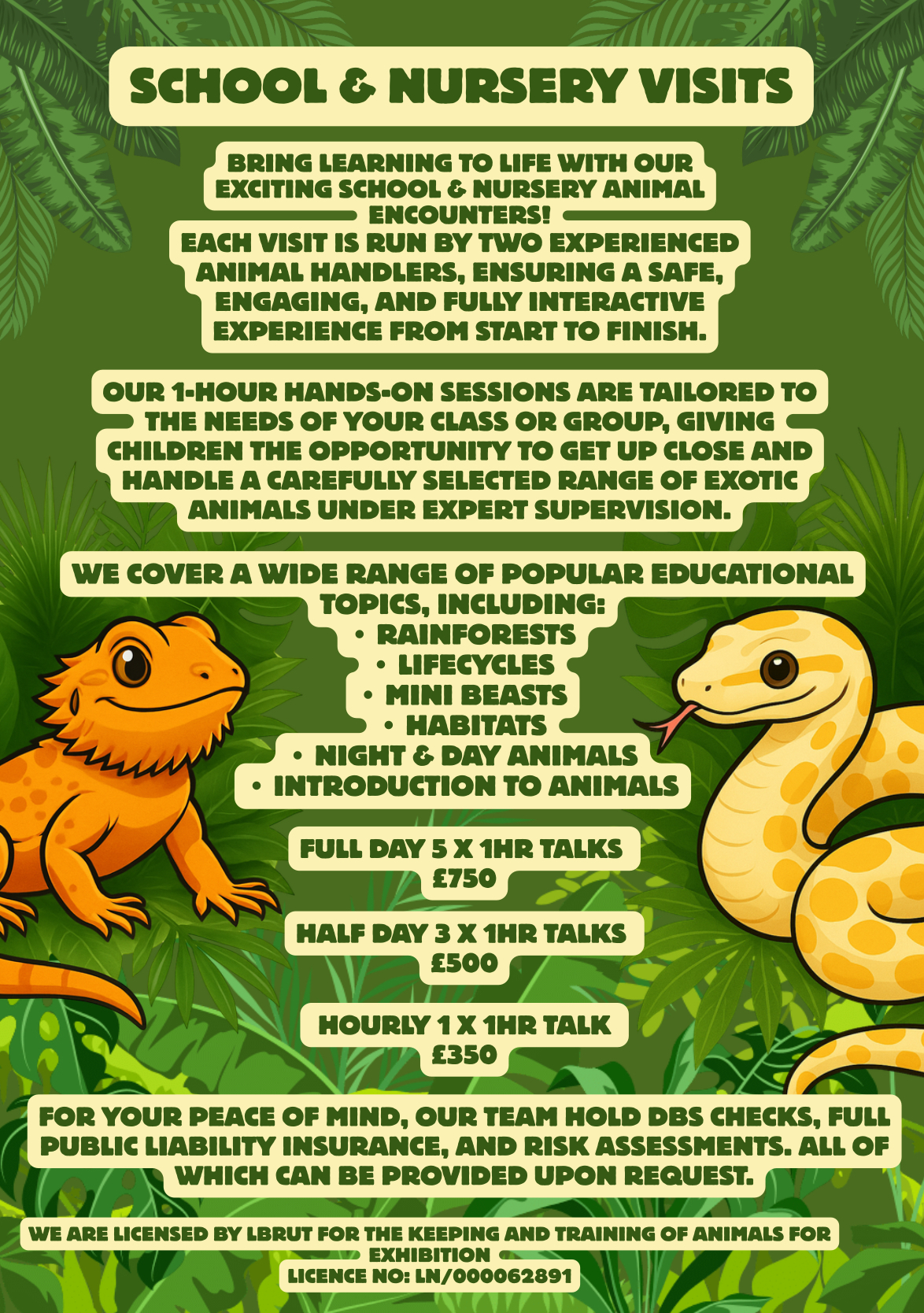 Hygiene is always paramount, and our handlers follow strict cleaning and handling protocols before, during and after any visit to ensure the safest possible environment for all children/attendees. This includes bathing all animals prior to every visit and sanitisation of their transport boxes before and after use.